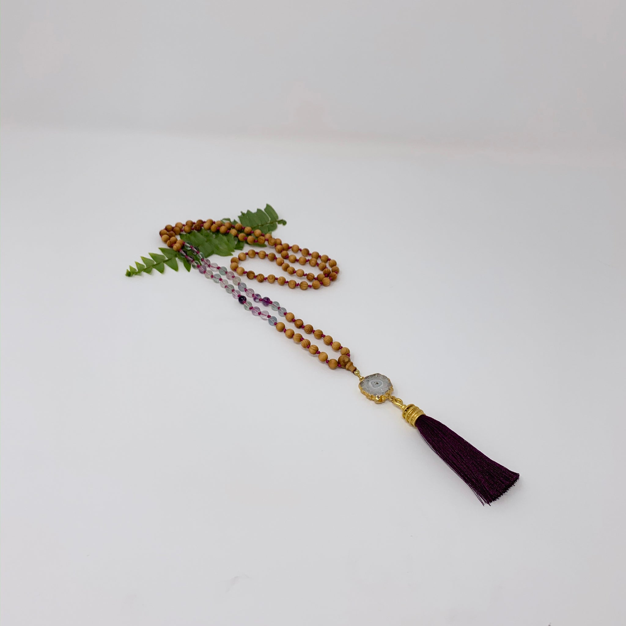This 108-bead mala pairs the natural clarity and tonal depth of fluorite with the warm texture and subtle fragrance of raw sandalwood. Hand-knotted for fluidity and durability, it’s designed to function as both a meditation tool and a distinctive style piece, elevated, intentional, and versatile.